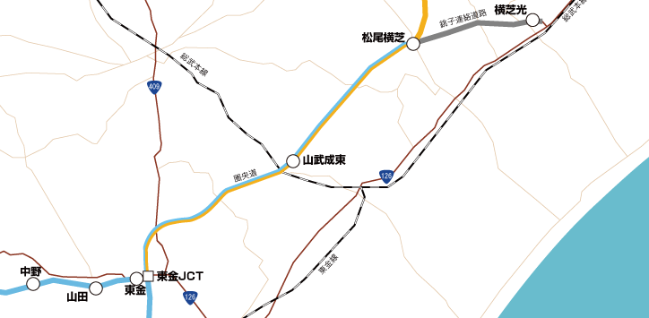 | 松尾横芝-東金IC・JCT | 16km | 4車線化・設計協議 ~一部工事中 |