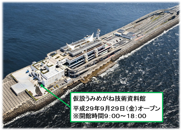 NEXCO東日本 関東支社 東京湾アクアライン管理事務所(千葉県木更津市)では、CA東京湾アクアライン 海ほたるPA 仮設うみめがね技術資料館を平成29年9月29日(金)にオープンします。開館時間は9:00〜18:00です。多くのお客さまのご来場をお待ちしております。