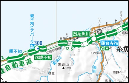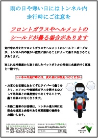 北陸道 親不知IC~糸魚川IC間にあるトンネル内を二輪車で走行中、シールドが曇ってしまい転倒してしまった。重大事故につながりかねないので、トンネル内の換気管理の徹底をしてほしい。