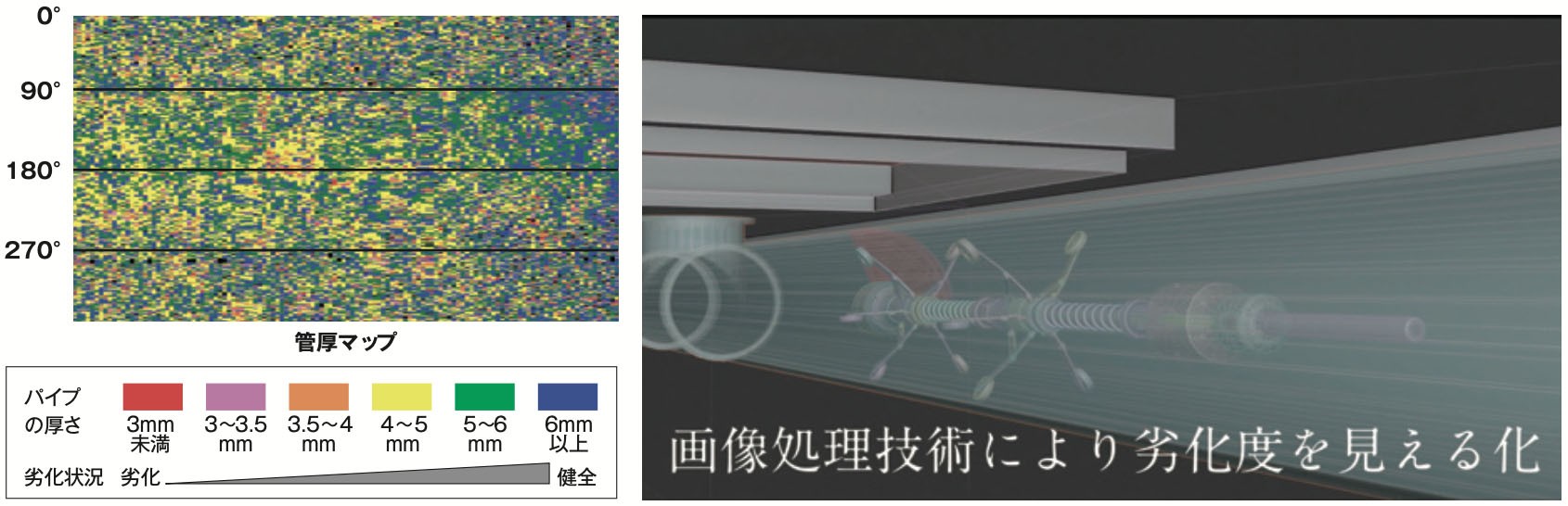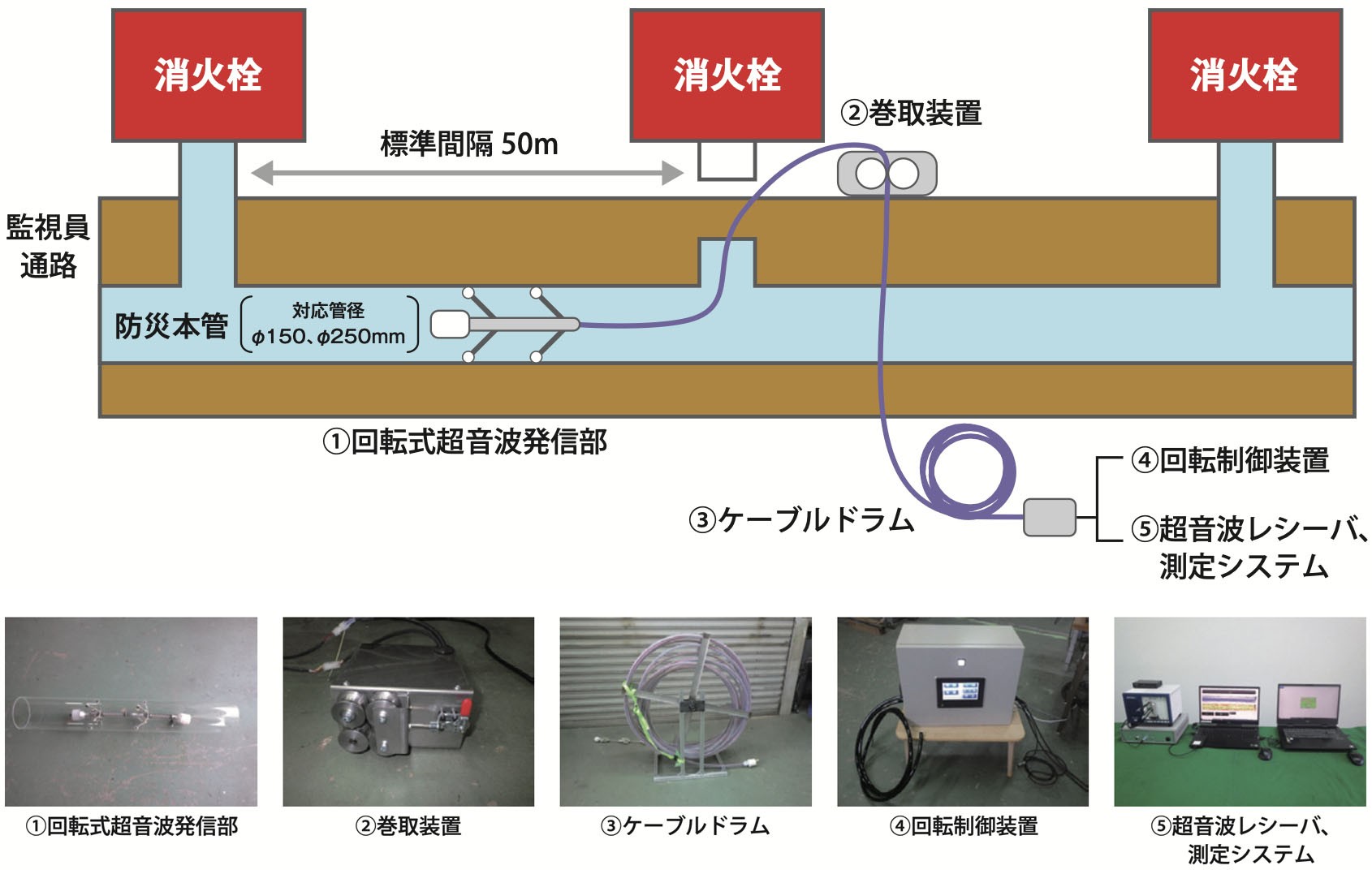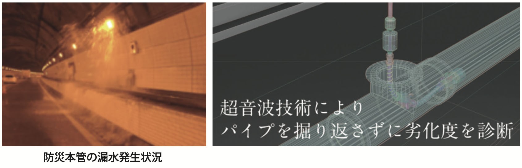 腐食により漏水が発生する前に、超音波技術でトンネル防災本管の劣化度を診断する装置「パイプミエールi」を開発。