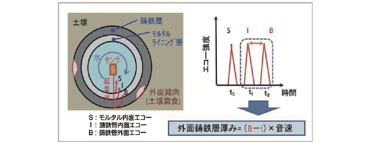 - 各層の反射エコーを検知し、時間差により鋳鉄管厚を算出