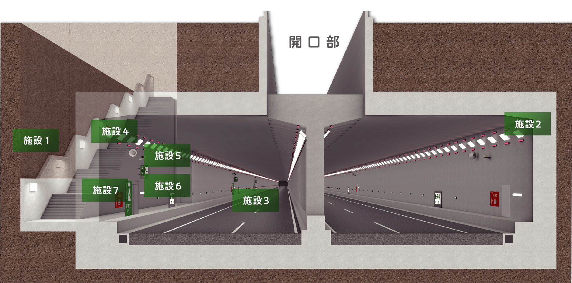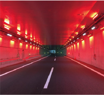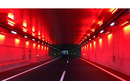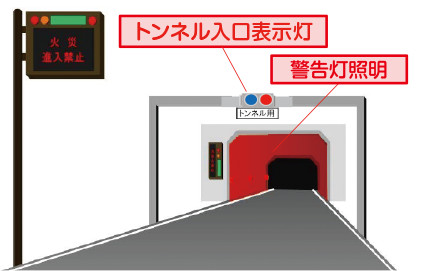 トンネル手前にトンネル入口表示灯及びトンネル壁面に警告灯照明を設置しています。非常時には、赤い警告灯を点滅させることで、この先に火災等が発生していることをお知らせします。