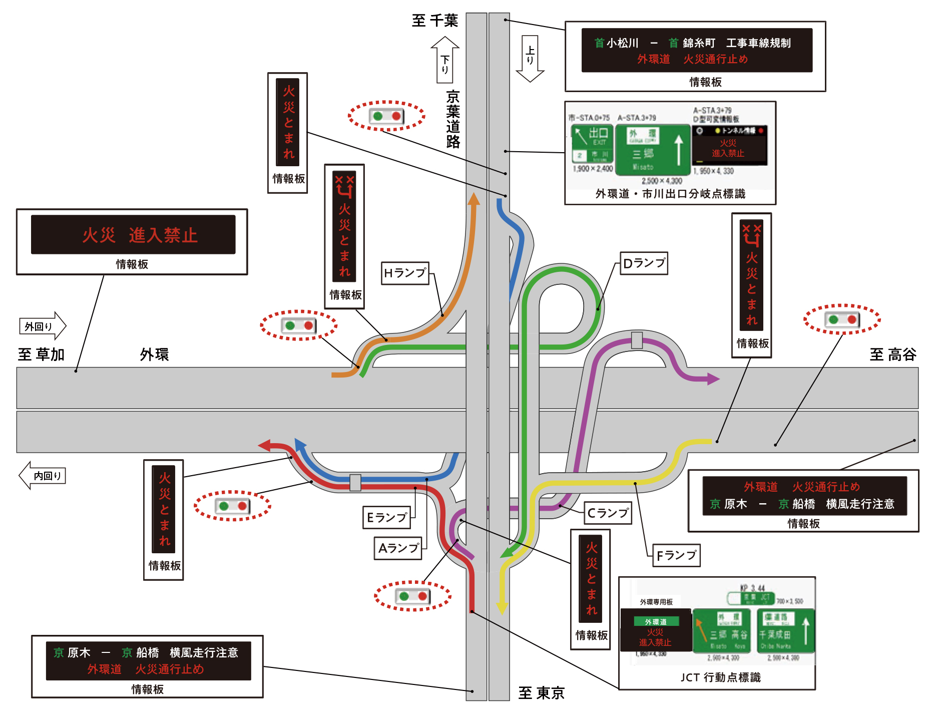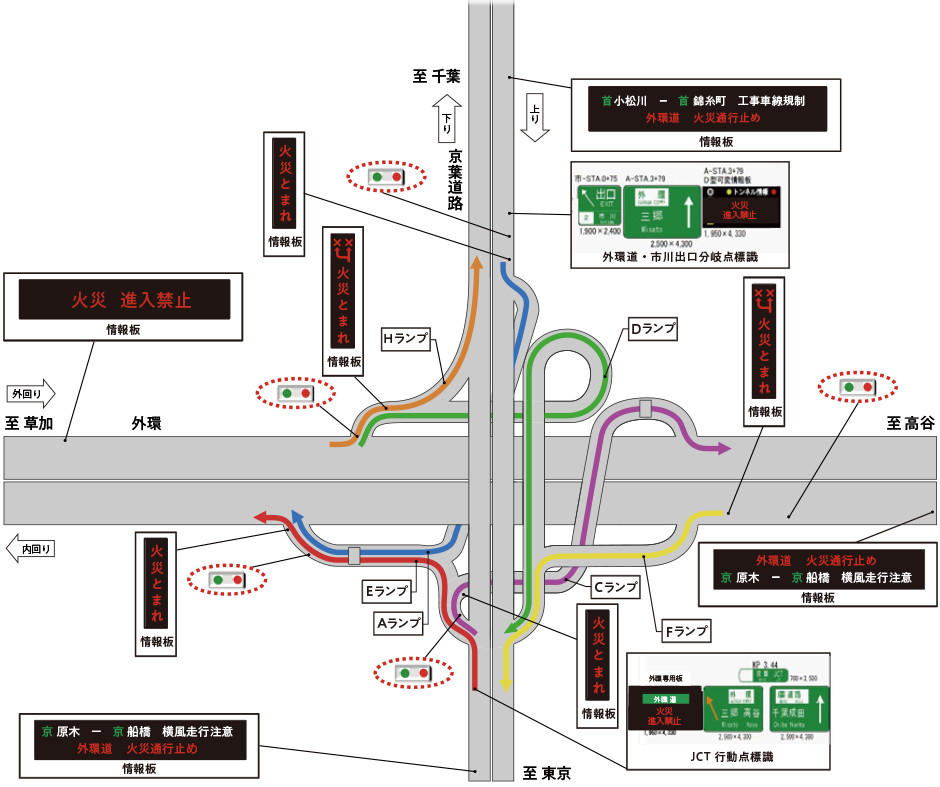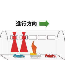 トンネル内が火災等で危険な状態になっている場合、進入を抑制する対策を講じています。警告灯照明、情報板にて、この先に火災等が発生していることをお知らせします。