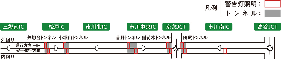 外環道本線においては、トンネル入口および橋の区間から掘割構造部への入口に警告灯照明を設置しています。