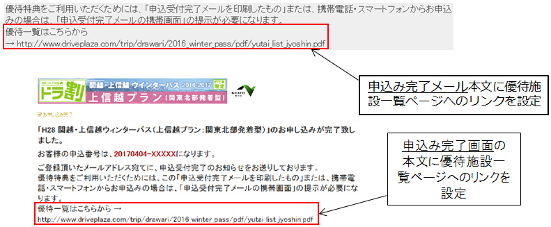 申し込み完了メールと申し込み完了画面本文に優待施設一覧ページへのリンクを設定のイメージ画像