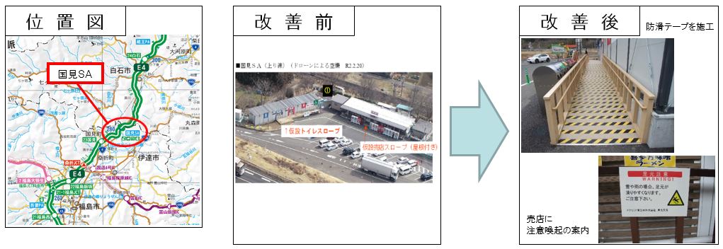 国見SA (上り線)のスロープが雨に濡れると滑るので、早急に対策をしてもらいたい。