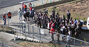 訓練当日は、各避難階段に仙台東管理事務所の社員を配置し、立入防止柵(蹴破り式)の使用方法を説明しました。また、避難先のすぐ脇の本線を、100km/hのスピードで走行する車がいることや、避難後に車との接触事故が起きないよう、十分に注意していただきたい旨、お願いをしました。
