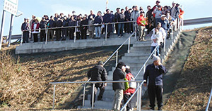このうち仙台東部道路の避難階段を使用した訓練では、岩沼市内に設置している3箇所のうち2箇所において一斉に実施し、全体で約160名の地域住民の方々が参加されました。