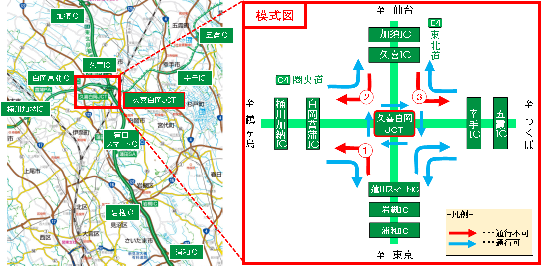 (1)閉鎖箇所:東北道・圏央道 久喜白岡JCTの3ランプ(※全3箇所一斉閉鎖)
