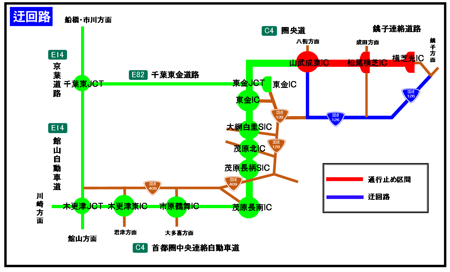また、圏央道と直結する銚子連絡道路(千葉県道路公社管理)についても、横芝光ICから流入したお客さまが松尾横芝ICから一般道に流出できないため、通行止め(流入禁止)となります。