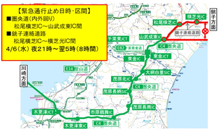 - 【C4】首都圏中央連絡自動車道 松尾横芝IC~山武成東IC間銚子連絡道路 松尾横芝IC~横芝光IC間 緊急夜間通行止めのお知らせ