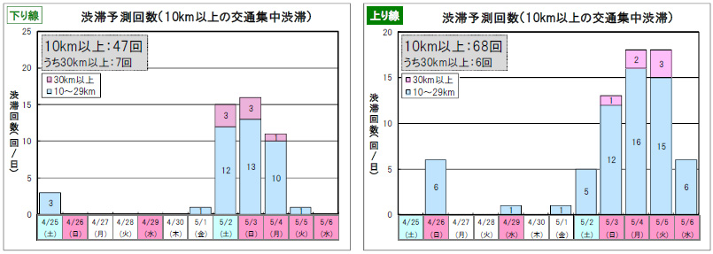 - Concerning the tendency of congestion during the Golden Week period, it is predicted that there will be a lot of congestion on the Out-bound line on May 2 (Sat) and 3 (Sun), and on the In-bound line on May 4 (Mon) and 5 (Tue). I am. (The traffic congestion tendency is as shown below)