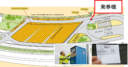 Parking control such as parallel parking is required at each departure time from a rest facility, and in Germany, parking tickets are issued (Figure 2) and departure times are displayed above the parking spaces (Photo 2). , controls are communicated to the driver.