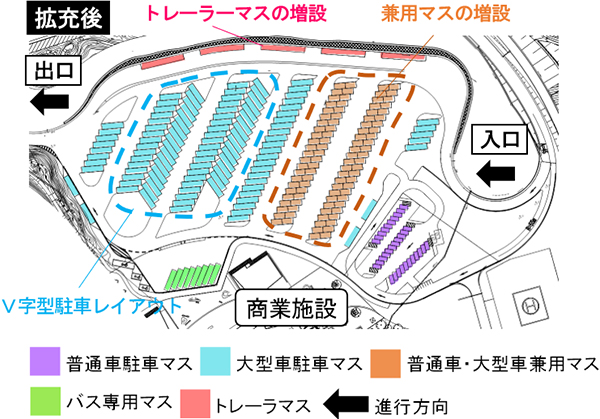 East Nippon Expressway Co., Ltd. (hereinafter NEXCO EAST), Central Japan Expressway Co., Ltd. (hereinafter NEXCO CENTRAL), and West Expressway Expressway Co., Ltd. (hereinafter NEXCO WEST) In response to congestion in car parking areas, efforts are being made to expand parking spaces for large vehicles.