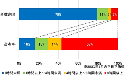 Chronic congestion occurs in parking lots for large vehicles in SA/PA, especially at night on weekdays. At E1 Tomei Ebina SA (In-bound), the number of large vehicles parked exceeds the number of parking spaces from 6 p.m. to 6 a.m. the following day. (Figure 12) Of these, the number of vehicles parked for 8 hours or more is about 10% (7%) of the total, but the occupancy rate is about 60% (57%). is the main cause of congestion. (Figure 13) Similar trends can be seen in other SAs and PAs, where vehicles that cannot be parked in large vehicle parking spaces are parked in inappropriate locations such as aisles or regular vehicle parking spaces. Masu. (Photos 9 and 10) In order to accommodate many customers, please use the parking lot appropriately, such as by refraining from parking for long periods in the SA/PA areas.