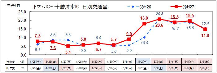 In particular, traffic jams of 5 km or more have decreased 5 times compared to the previous year, and have decreased significantly. - The longest traffic congestion was due to the traffic concentration that occurred on May 5 in the direction of Sapporo between the Mukawa Hobetsu IC and the Shimukappu IC on the Doto Expressway. It became 13km.