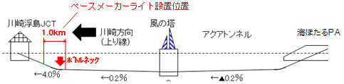 In-bound congestion in the vicinity of Kawasaki floating island JCT of the line, loose in the aqua tunnel In-bound the steep hill from In-bound has occurred at the point where the gradient changes in slope. Cause of the traffic jam, "In-bound is the rate of decrease in the slope".