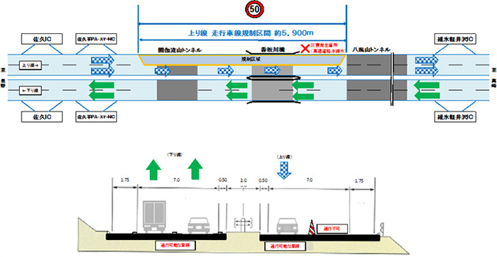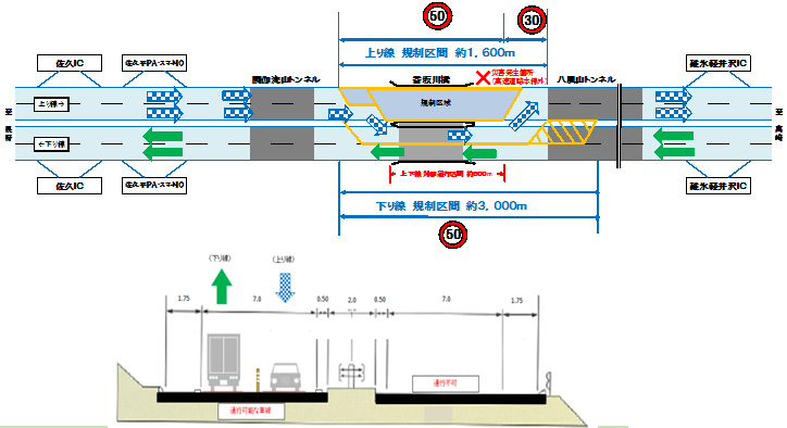 The traffic restrictions for the Out-bound line (bound for Nagano) in the same section were lifted at 6 am on Friday, April 25. You can still drive in two lanes on each side as usual.