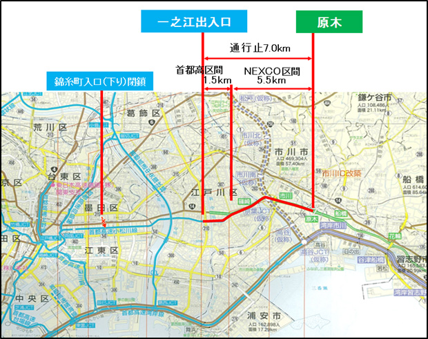 一之江~原木IC間(約7km)の所要時間は通常約7分ですが、迂回ルートを使用した場合、所要時間は約26分となりますので、時間にゆとりをもってお出かけください。また、市川市役所方面をご利用のお客さまは、都道318号(環七)~国道14号(千葉街道),千葉県道180号~国道14号(千葉街道)をご利用ください。迂回路の詳細は別紙1【PDF:407KB】を参照してください。