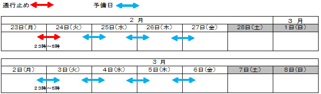 それに伴い、2月23日(月)23時から翌朝5時までの間(予備日:2月24日から3月6日:金・土・日を除く1夜間)、同区間において夜間通行止めを行います。