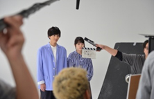 外環道開通のWEBCMの撮影が行われたのは、春らしい温かな陽気の4月上旬。爽やかなブルーの衣装に身を包んだ川栄さんと志尊さんがスタジオに入るとすぐに、お互いが声を合わせるシーンの撮影が始まりました。同級生コンビということもあり、息ぴったりの演技で撮影は順調に進みました。