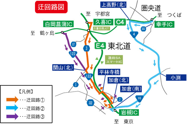 If you detour between Kuki IC and Iwatsuki IC as shown in the figure below, it will take about 26 minutes (usually about 12 minutes).