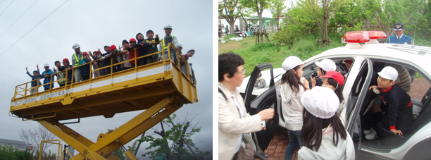 高速道路ではたらく車(リフト車)やパトカーに試乗。普段乗ることのない車に興味津津!の写真
