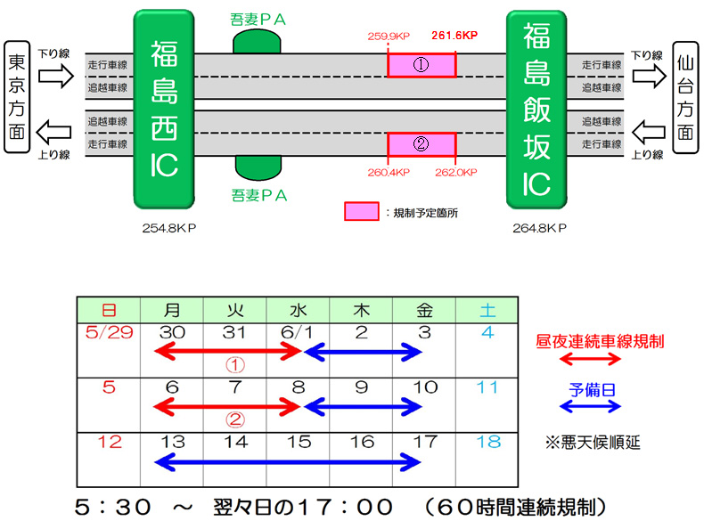 NEXCO東日本福島管理事務所(福島県福島市)は、東北自動車道福島西インターチェンジ(IC)~福島飯坂IC間において福島ジャンクション(JCT)建設に伴い、下記のとおり昼夜間連続車線規制を実施します。