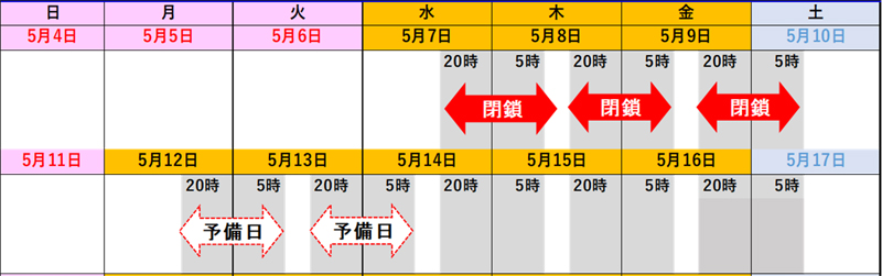 - Date and timeImplementation date:May 7th (Wednesday) - May 9th (Friday), 2020Every day from 8pm to 5am the following morning, excluding weekends and holidaysPreparation day:May 12th (Monday) to May 13th (Tuesday), 2020Every day from 8pm to 5am the following morning, excluding weekends and holidays
