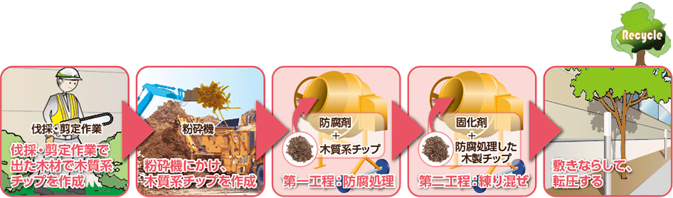 It is a mulching method that exerts a high weed control effect by kneading antiseptic-treated wood chips with a solidifying agent and laying them down.