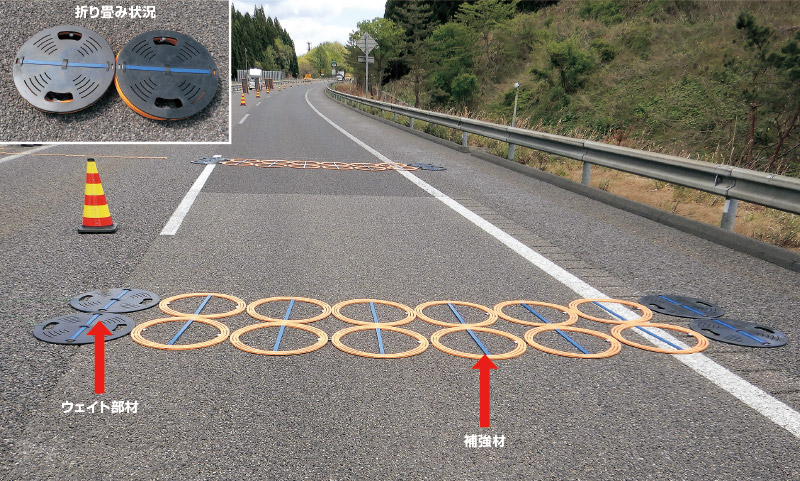 2. 両端部のウェイト部材が、車両通過時の移動や捲れ上りを抑制します。