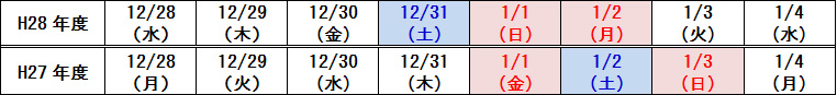 【참고】 2016 년도 연말 연시 기간 헤세이 27 년도 같은 기간의 요일 배열