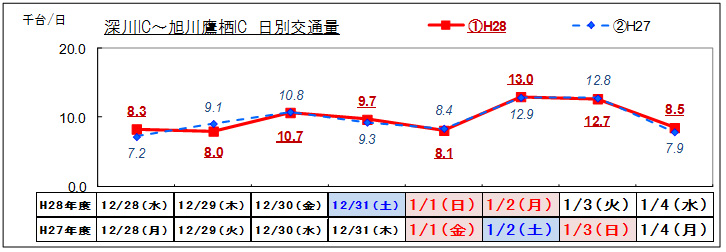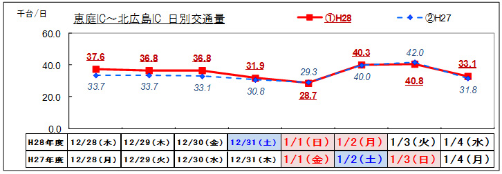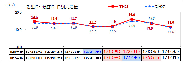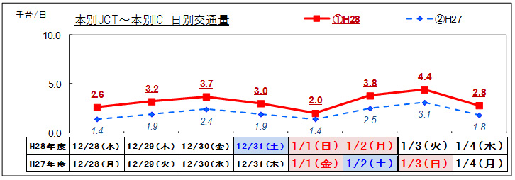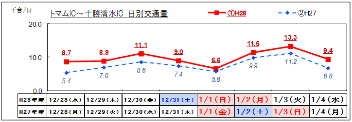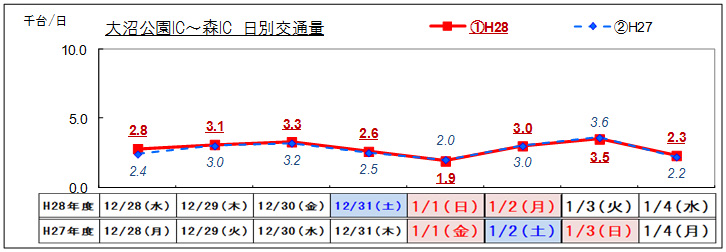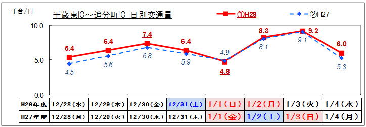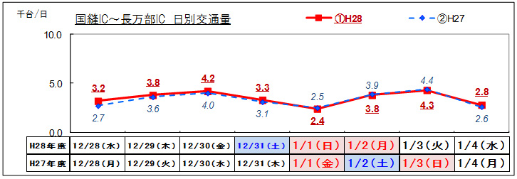 - 교통량은 트래픽 카운터 [도로에 비치되어있는 교통량 자동 계측 장치]의 속보치에 의한 H28.12.28에서 H29.1.4까지 8 일간의 일 평균 교통량입니다. (비교 대상은 H27.12.28에서 H28.1.4까지 8 일간)