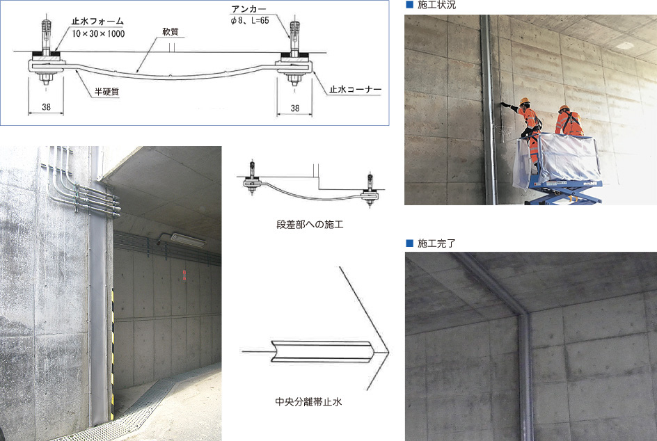 漏水対策用樋に柔軟性素材を採用したことにより地震などの振動による樋の破損の防止と段差箇所への追従性を高めました。