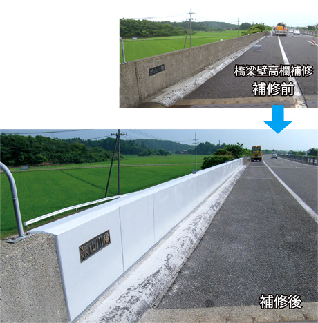 コンクリート構造物(橋梁壁高欄、トンネル監視員通路側壁等)の断面修復
