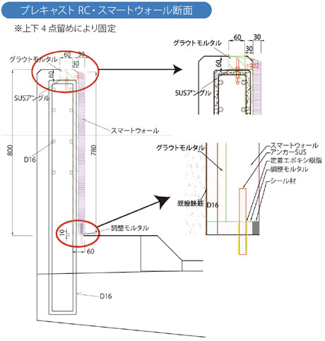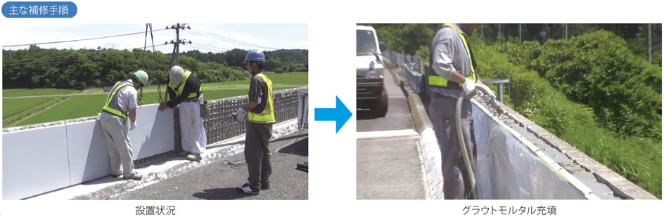 プレキャスト製のRCパネルを型枠として設置し、内部にグラウトモルタルを充填することにより一体化を図り、早くて安いコンクリート構造物補修を実現しました。