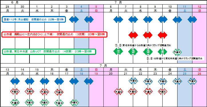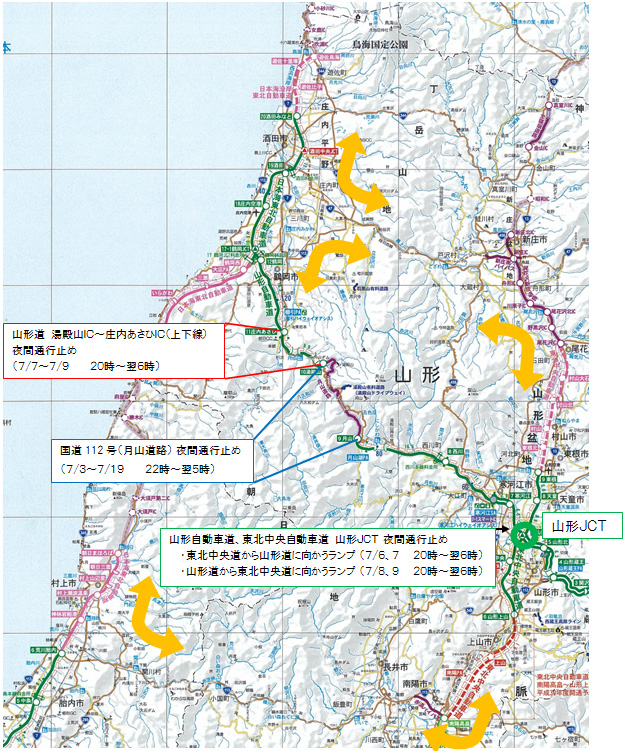 また、国道112号(月山道路)の夜間通行止め期間中、山形自動車道、東北中央自動車道において、夜間通行止めを実施予定です。