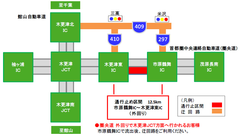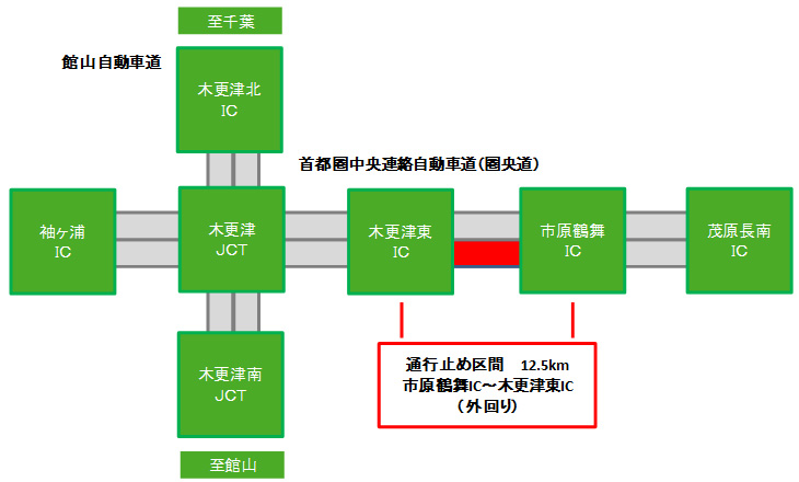 - 首都圏中央連絡自動車道 市原鶴舞IC~木更津東IC間(外回り)緊急通行止めのお知らせ