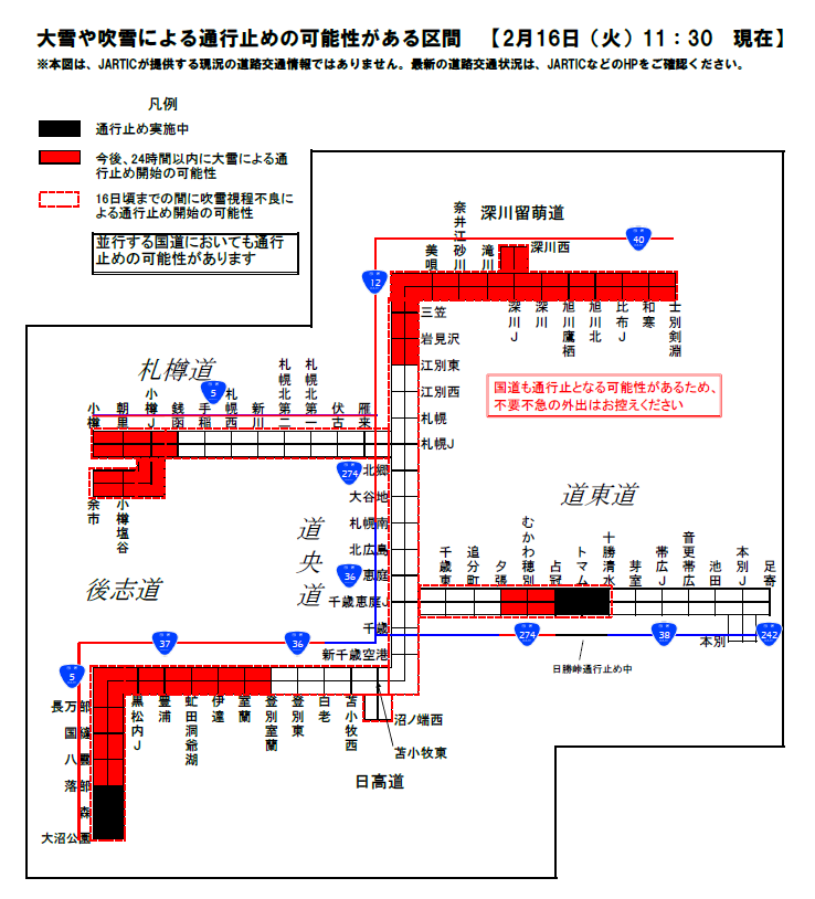 - 北海道内の吹雪による通行止めのお知らせ(2月16日11時30分現在)