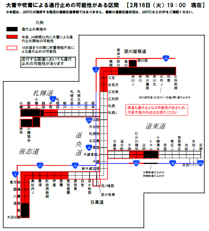 | 北海道内では、吹雪の影響で、高速道路の一部区間の通行止めを実施しています。最新の通行止め情報は、 道路交通情報NOW!! (日本道路交通情報センター)などをご覧ください。通行止めとなっている区間については、並行する国道も通行止めとなっている可能性がありますので、広域の迂回などの対応をお願いします。 |