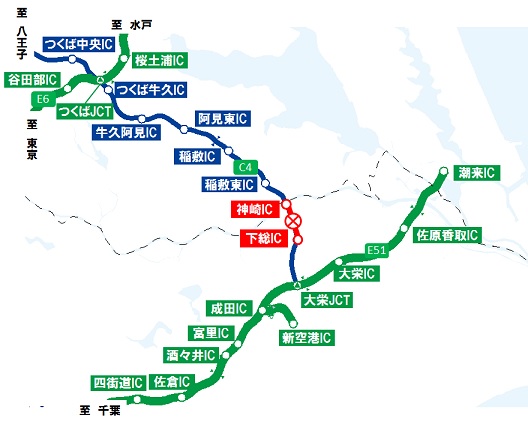 NEXCO東日本 千葉管理事務所(千葉県千葉市)では、C4首都圏中央連絡自動車道(以下「圏央道」)神崎(こうざき)インターチェンジ(以下「IC」)から下総(しもふさ)IC間にて、段差修正のための舗装補修工事に伴う緊急夜間通行止めを行います。