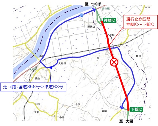 迂回にあたっては、青色矢印のとおり、国道356号等をご利用ください。