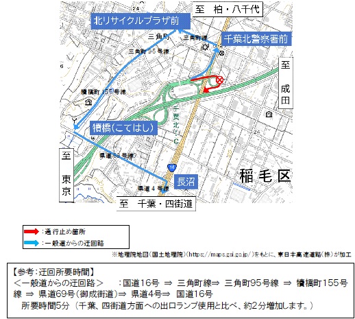 NEXCO東日本 千葉管理事務所(千葉県千葉市)では、E51東関東自動車道(以下「東関東道」)千葉北インターチェンジ(以下「IC」)にて、橋梁補修の緊急工事を行うため、千葉・四街道方面の出口ランプ閉鎖を実施します。