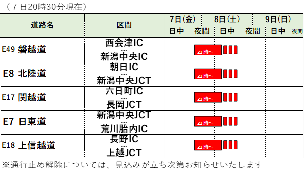 2月7日夜から8日にかけて、この冬一番の強い寒気の影響により新潟県(全域)で大雪が予報されています。これにより新潟県・富山県(一部)・長野県(山間部)・福島県(会津地域)を中心とした以下の区間で予防的通行止めを実施します。