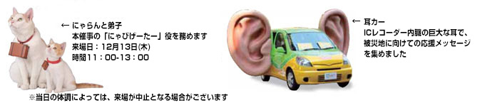 催事期間中、会場内にある3種類のスタンプを応募券に押印して抽選会にご参加いただくと、NEXCO東日本のSA・PAで使用できる「ソフトクリーム無料券」や「にゃらん」グッズが当たります。[期間 平成24年12月13日(木)~12月18日(火)] - 応募抽選プレゼント: