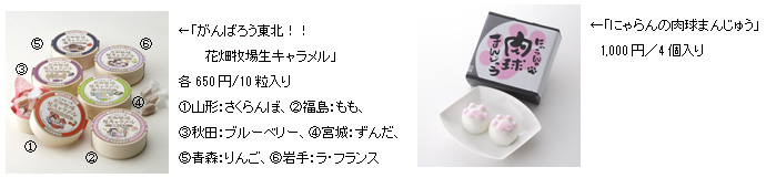 会場内の「NEXCO東日本 セレクトショップ」では、東北六県の食材と生キャラメルがコラボした「がんばろう 東北!! 花畑牧場生キャラメル」(6種 各650円/10粒入り 青森:りんご、岩手:ラ・フランス、宮城:ずんだ、秋田:ブルーベリー、山形:さくらんぼ、福島:もも)を販売。 また、じゃらんブースでは、見た目が"にゃらん"の 肉球そっくりな「にゃらんの肉球まんじゅう」(1,000円/4個入り)も期間中特別販売いたします。