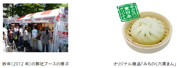 メイン会場の弊社ブースでは、「超人シェフ倶楽部」の有名シェフが開発した特製ソースで召し上がる若鶏の唐揚げや昨年の東北六魂祭でご好評をいただいた「みちのく六県まん」(肉まん)などを販売し、売上金の一部を東日本大震災の義援金として寄付します。