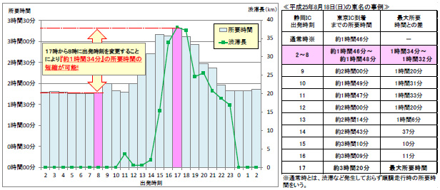 出発時刻をずらすことで渋滞を避けることができ、所要時間の短縮が可能でした。(下表参照)