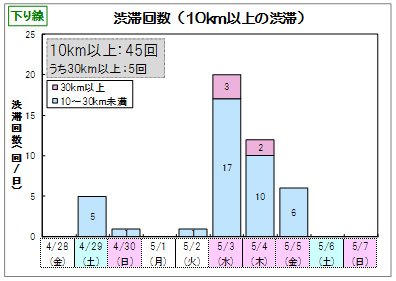 • 最大の渋滞長は、5月3日(水)8時55分頃、関越道(下り線)花園IC付近を先頭に発生した49.0kmでした。