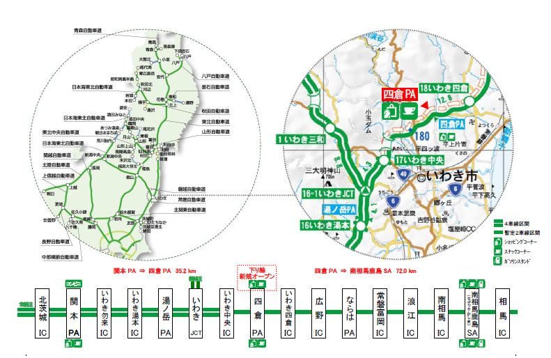 - 当PA前後の常磐道(下り線)では商業施設間距離107km(関本PA→南相馬鹿島SA)が、35km(関本PA→当PA)・72km(当PA→南相馬鹿島SA)に短縮